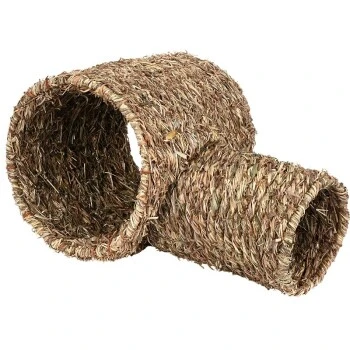 Da der Tunnel aus geflochtenem Gras und damit aus 100% natürlichen Materialien besteht, ist dieser leicht verdaulich und dient nicht nur als Tunnel, sondern auch zum Knabbern. Er besteht aus zwei Teilen und besitzt 3 Tunnel Eingänge.
