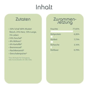 Inhalt: Die einzigartige Kombination aus Schaf, Zucchini, Petersilienwurzel, Kartoffel und Nachtkerzenöl versorgt Ihren Hund im Sommer mit allen wichtigen Proteinen, Mineralstoffen, Vitaminen und Fetten. Für ausgeglichene Tage in der Sommerzeit. Unser Nassfutter besteht aus 100% natürlichen Zutaten und ist frei von Gluten und Getreide, wodurch es sehr leicht verdaulich ist und sich ausgezeichnet für Allergikerhunde eignet. Ohne Zuckerzusatz, Farb- & Konservierungstoffe und Geschmacksverstärker.