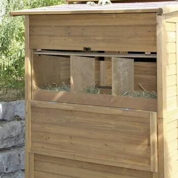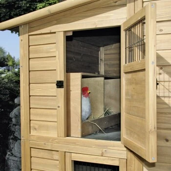 Das Hühnerhaus hat zwei Etagen die mit einer Treppe verbunden sind. Insgesamt sind sechs Türen vorhanden die einzeln zu öffnen und verriegelbar sind. Das Gehege ist durch zwei Schiebetüren von dem Haus abgetrennt.