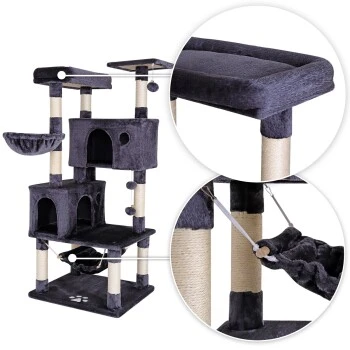 - IDEALES SPIEL- UND RUHEPARADIES. Die vortreffliche Ausstattung dieses Katzenbaumes mit 2 Höhlen und Plüschbällen mit Glocken befriedigt den Spieltrieb Ihrer Katze. Das gemütliche Liegebett, die Liegemulde und die bequeme Hängematte unterstützen zusätzlich die benötigten Ruhephasen und auch das beliebte Beobachten kommt auf der Aussichtsplattform nicht zu kurz. Die perfekte Balance zwischen Spielspaß und Rückzugsmöglichkeiten.