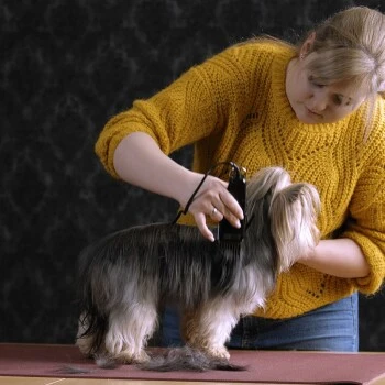 Scheren / Trimmen: Das Tier soll individuell nach seinem Felltyp und der Rasse gepflegt werden. An die gewünschte Schnittlänge herantasten, zum Beispiel mit unterschiedlichen Aufschiebekämmen, von groß nach klein, vorerst an einer verdeckten Stelle testen.