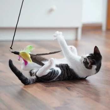 Gemeinsame Spieleinheiten stärken die Bindung zwischen dir und deiner Katze. Außerdem hält das Spielen die Katze fit und beugt Übergewicht vor. Katzen, die bereits übergewichtig sind, sollten täglich mit Katzenspielzeug zum Spielen animiert werden, um wieder ein gesundes Gewicht zu erreichen.
